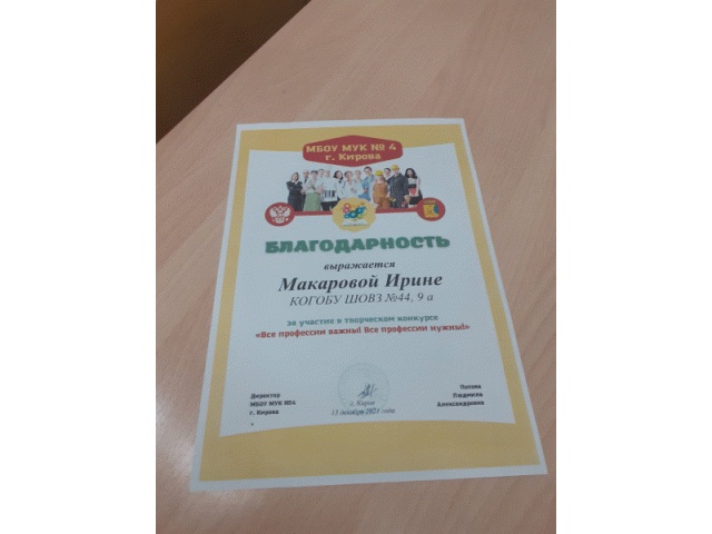 Внимание! Конкурс! С 06. по 10 декабря в МУКе проходила неделя профориентационной работы В рамках этой недели прошла выставка творческих работ. Конкурс под названием "Все профессии важны!" Конкурс вызвал большой интерес у ребят 2-9х классов. Они с интересом приняли участие в конкурсе, представив работы по различным номинациям. 2б класс(кл.руководитель И.В.Фарафонова) представили поделку и презентацию о профессиях, ребята5а класса (кл.руководитель Н.В.Малышева ) -- рисунки и поделку: светильник "Сова", 9в класс(кл.руководитель О.Н.Титова) отправили презентацию "Все работы хороши!", а учащиеся 9а класса (кл. руководитель Е.П.Стрелкова) послали на выставку 6 самодельных открыток к профессиональным праздникам, выполненных в технике скрапбукинг. Конкурс подошёл к концу. За активное участие ребята отмечены Грамотами, Дипломами и Благодарностями .